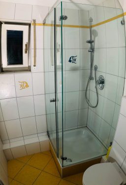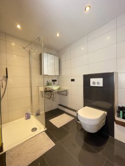 Der Wohn- und Schlafbereich ist geschmackvoll eingerichtet und bietet neben einem bequemen Bett auch einen Arbeitsplatz und einen Essbereich. Die Einbauküche ist komplett ausgestattet – Geschirr, Besteck und Kochutensilien sind bereits vorhanden. Das Tageslichtbad verfügt über eine Dusche und moderne Sanitärausstattung.